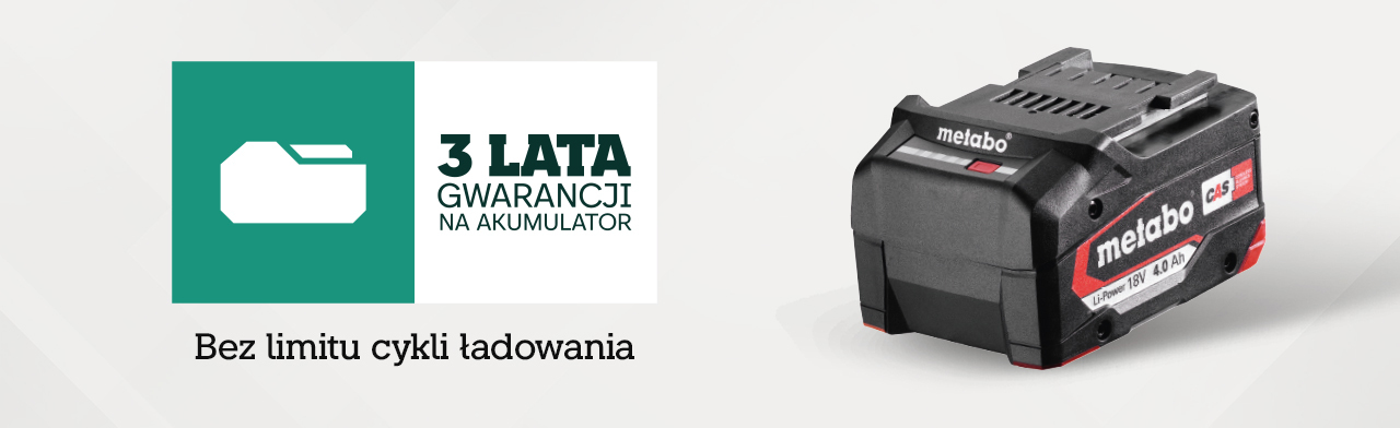 Skorzystaj z wyjątkowej okazji — akumulator gratis do każdego zakupionego narzędzia akumulatorowego Metabo 18 V! Wystarczy, że dokonasz zakupu i zarejestrujesz go na naszej stronie internetowej z kodem "AkuGratis", a my zajmiemy się resztą. Akumulator zostanie wysłany bezpośrednio do Ciebie kurierem. Pamiętaj, żeby zarejestrować swój produkt w ciągu 4 tygodni od daty zakupu!