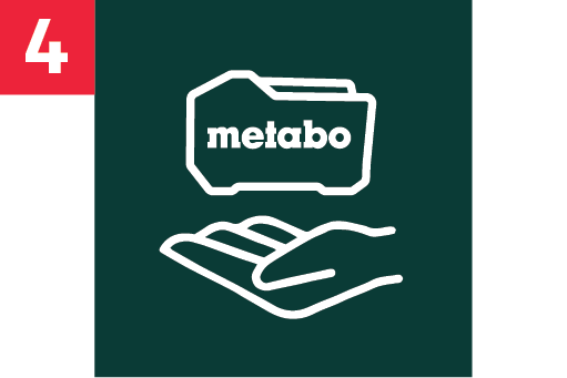 Pakiet Full Service pokrywa wszystkie koszty napraw do 3 lat (również materiałów eksploatacyjnych) bez względu na przyczynę usterki. Pakiet ten możesz wybrać podczas zakupu maszyny u autoryzowanego dealera Metabo. Otrzymasz wtedy kod usługi (w postaci zdrapki), który należy wprowadzić rejestrując urządzenie.